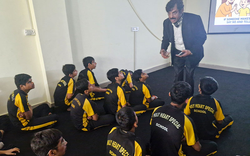 An awareness session on Good Touch and Bad Touch was organized for the students of Holy Heart Special School. A visiting advocate conducted the session, explaining the concept in a simple and age-appropriate manner to help children understand personal safety and boundaries. Through interactive discussions and examples, the students learned how to identify safe and unsafe touch and the importance of immediately informing a trusted adult in case they ever feel uncomfortable.